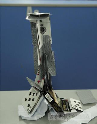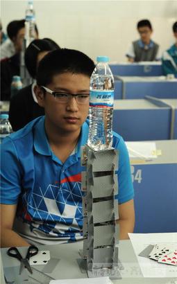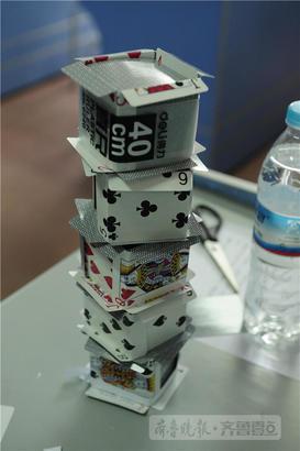 來自濟南龍奧學(xué)校的考生張文才第一個完成了考試,他完成的平臺一共五層,高度達40多厘米,用完了54張撲克牌。