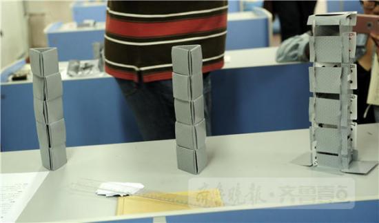 有考生20多分鐘就成功搭建好了平臺,并將滿滿一瓶礦泉水穩(wěn)穩(wěn)地放了上去。而有的考生直到考試結(jié)束,還沒有一個成形的平臺樣子。平臺的形狀也是五花八門,有的是三棱體,有的是四棱體,還有的做成了金字塔的形狀。