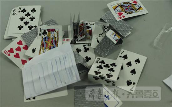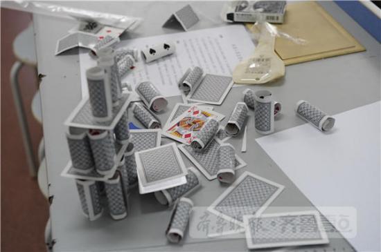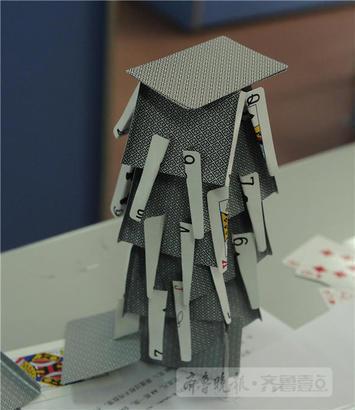 來自濟南龍奧學(xué)校的考生張文才第一個完成了考試,他完成的平臺一共五層,高度達40多厘米,用完了54張撲克牌。